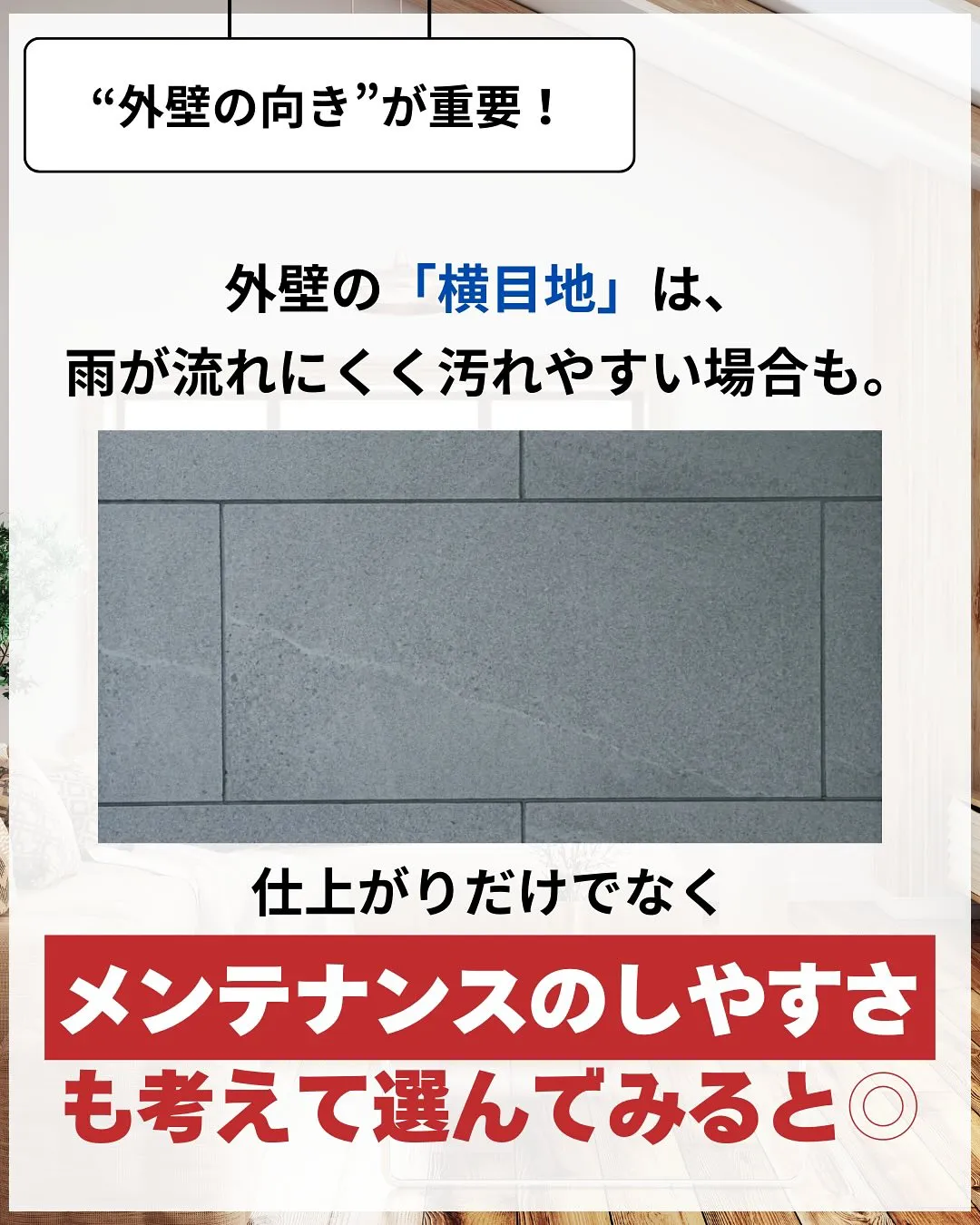 外壁の「横目地」は、雨が流れにくく汚れやすい場合があります。仕上がりだけでなく、メンテナンスのしやすさも考えて選びましょう。